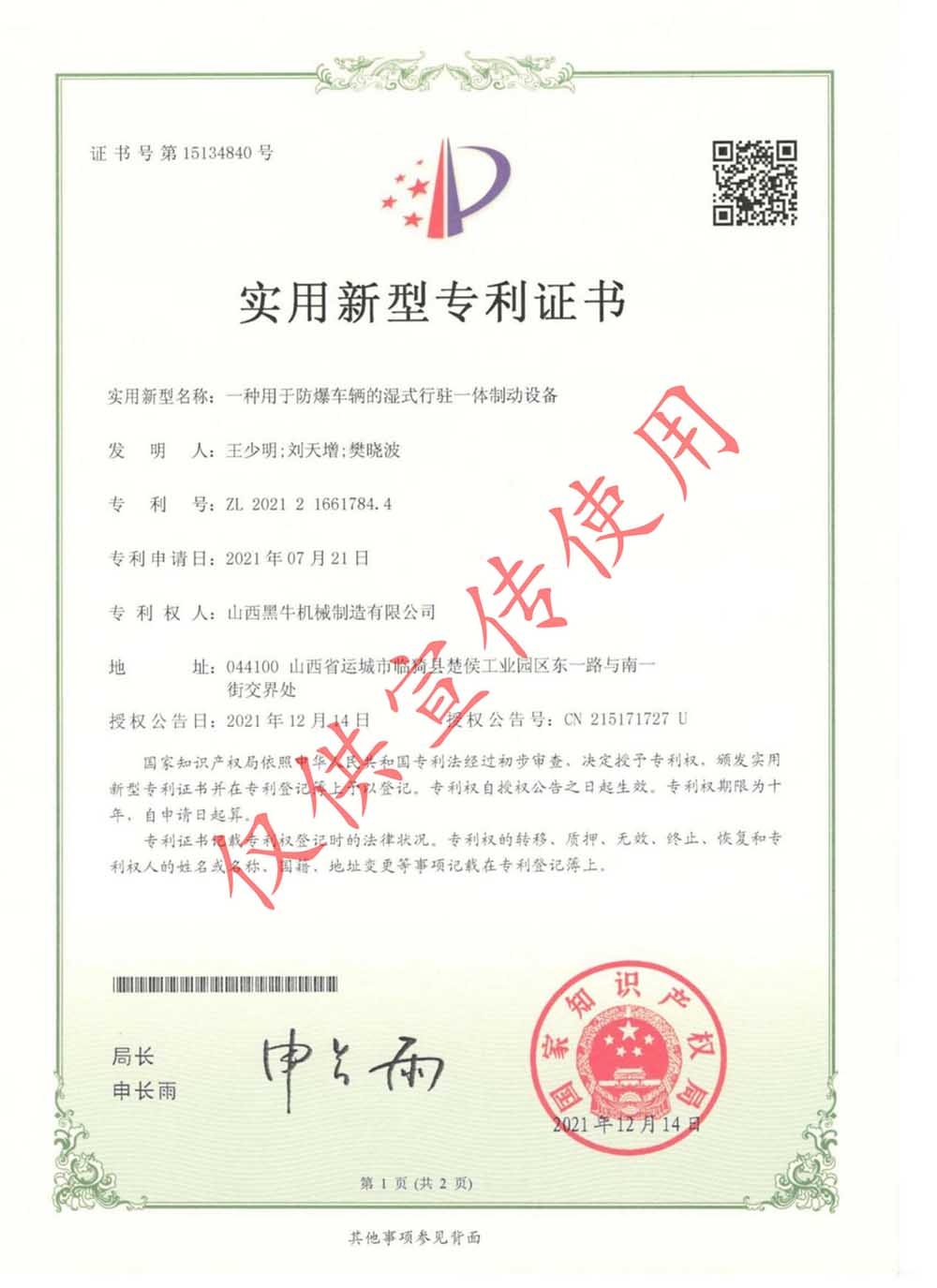 實(shí)用型專(zhuān)利證書(shū)